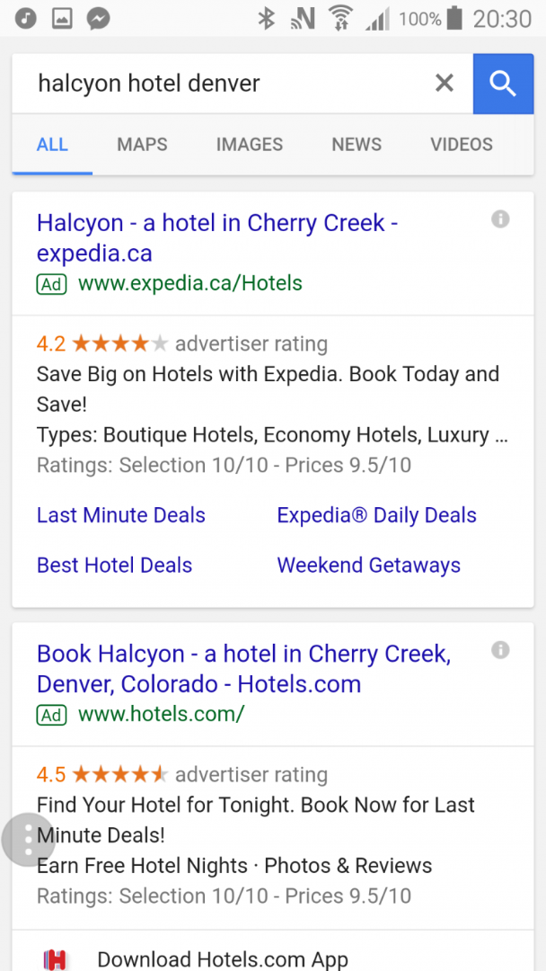 Αυτό που μας δείχνουν τα αποτελέσματα από κινητό τηλέφωνο είναι ότι το παραδοσιακό SEO έχει περάσει σε δεύτερη μοίρα καθώς την θέση του έχουν πάρει οι διαφημίσεις. Ουσιαστικά, οι καλύτερες ευκαιρίες για κλικ έχουν εξαφανιστεί για τις ιστοσελίδες των ξενοδοχείων.