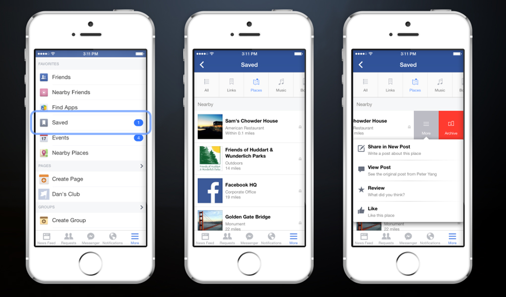 Τo Facebook θα σου επιτρέπει, από όλες τις συσκευές, με ένα κλικ, να κάνεις μία ανάρτηση "save for later" . Επιπλέον θα υπάρχει και η δυνατότητα στους publishers να κάνουν embed σε web pages ένα κουμπί "Save to Facebook", το οποίο θα επιτρέπει σε χρήστες να σώζουν άρθρα στο Facebook χωρίς να το έχουν ανοιχτό. Όλες οι "Saved" αναρτήσεις/σελίδες θα είναι συγκεντρωμένες σε ένα tab στο προφίλ τους.
