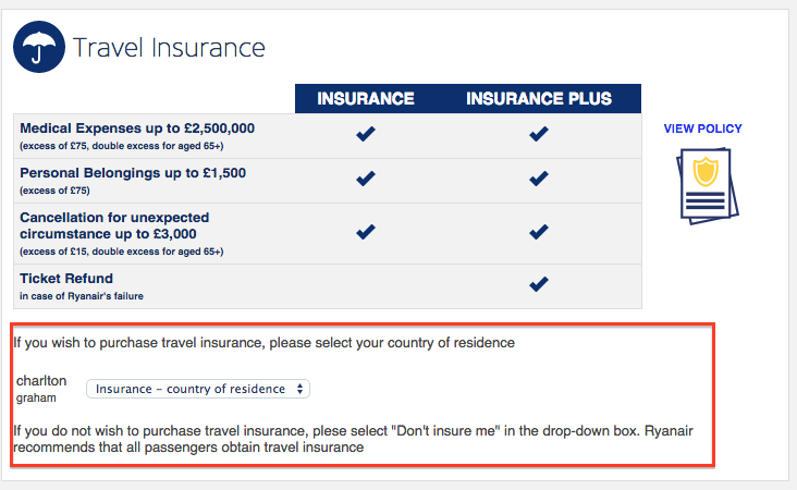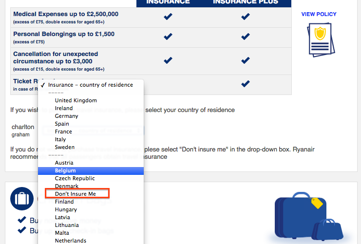 Εδώ, δεν μπορώ να περάσω στο επόμενο βήμα της κράτησης χωρίς να αποφασίσω για την ασφάλεια επιλέγοντας είτε τη χώρα μου είτε το 'don't insure me' από το drop-down.