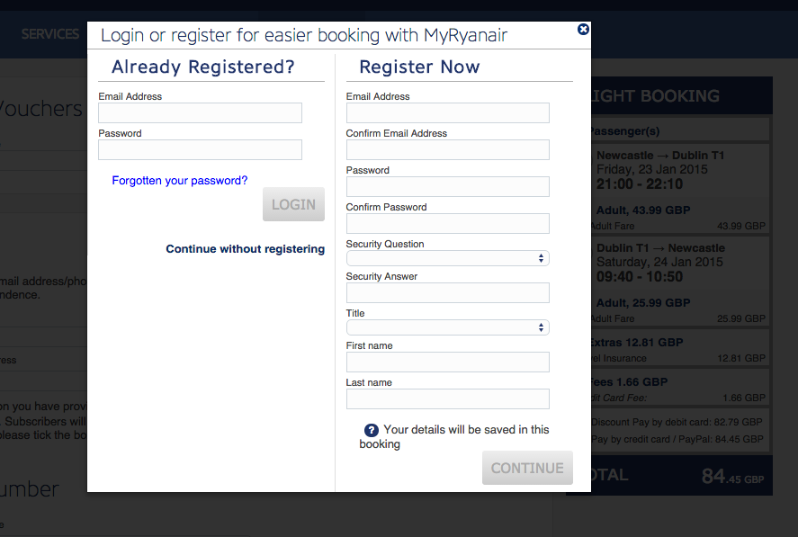 Είναι επίσης σημαντικό να αποφευχθούν εμπόδια στην κράτηση. Εδώ, η φόρμα της Ryanair δείχνει ακόμα περισσότερο σαν μια διακοπή, αφού παρουσιάζεται ως ένα pop up, που μαυρίζει όλη την υπόλοιπη οθόνη.