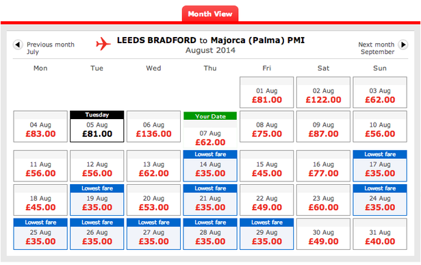 Τα αποτελέσματα αναζητήσεων επίσης βοηθάνε. Το 'month view' από το Jet2.com είναι πολύ χρήσιμο εάν είστε ανοιχτός στις ημερομηνίες και θέλετε απλά την πιο φθηνή λύση.